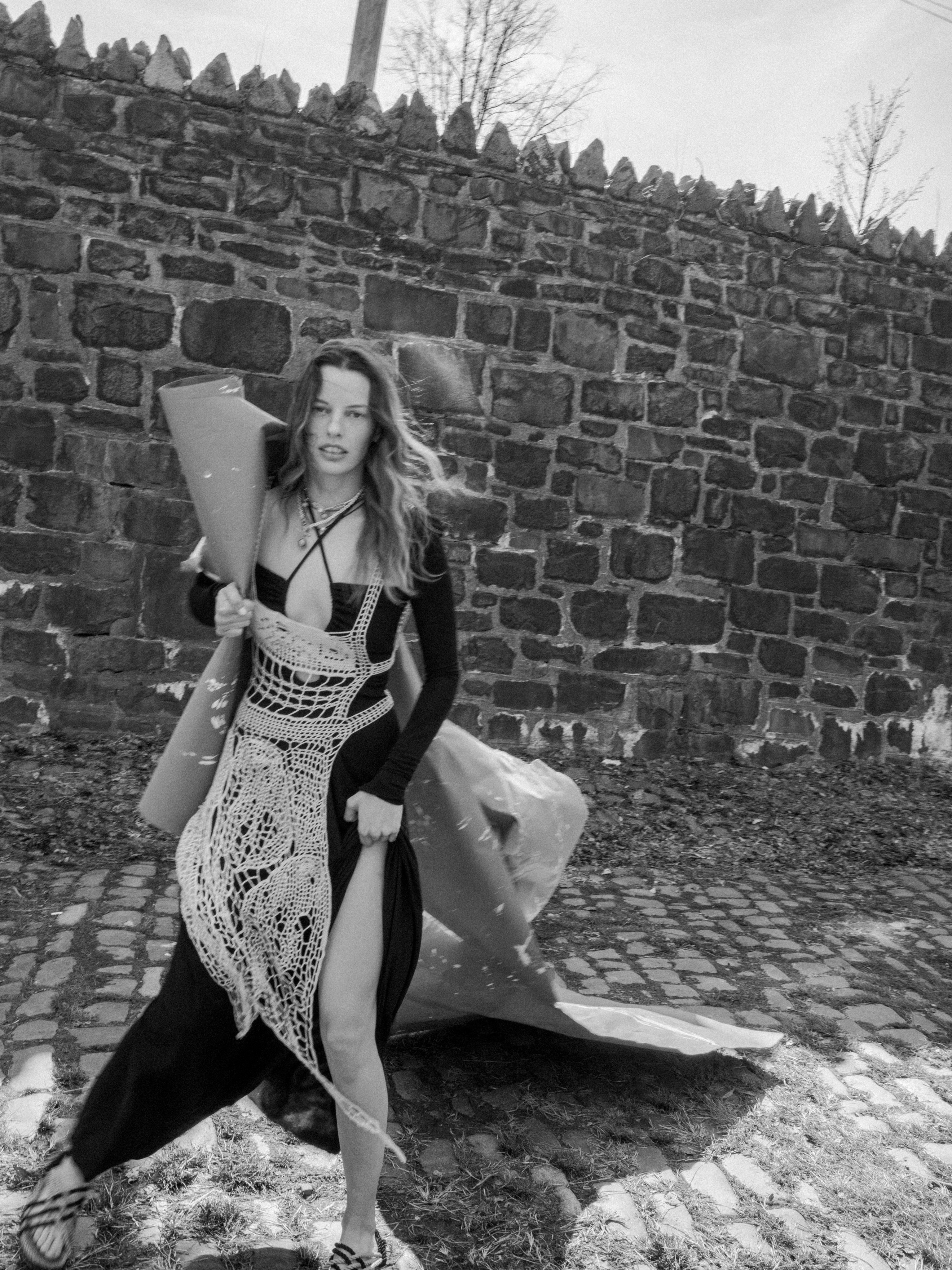 The apron serves as a layer that can be placed on and off the body. Like many insects that shed their exoskeletons periodically, these transparent lace aprons are meant to capture the different facets and stages of transformation in femininity.