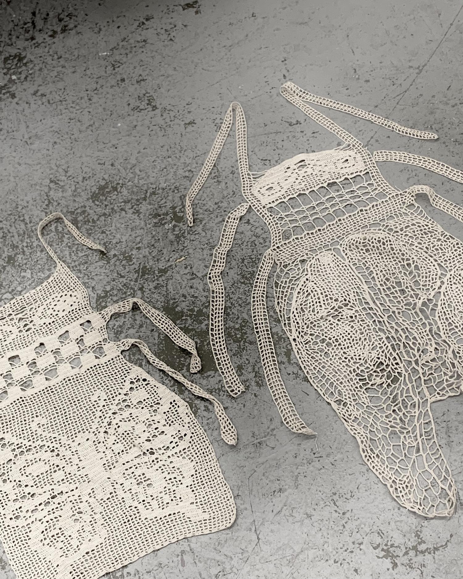 Inspired by photography of my mother and her sister in Venezuela wearing diffferent crochet pieces by my grandmother. On the right is a photo of my grandmother laying on the bed covers she made
